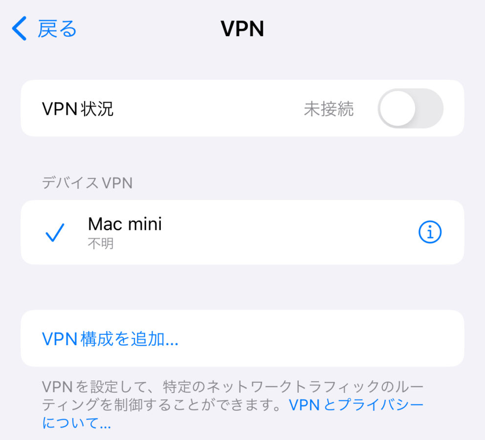 ただし全ての通信でMacminiを挟むようになる上、L2TP自体が高速な接続プロトコルではないので、必要な時以外はVPNをオフにしておくのが望ましい。