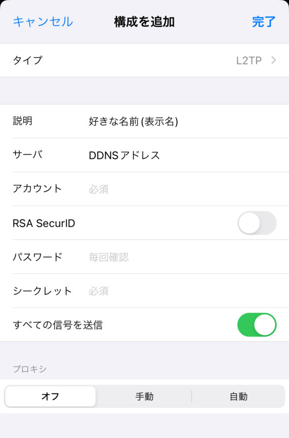 タイプをL2TPへ変更。DDNSアドレス・アカウント・パスワード・シークレットを打ち込む。説明は設定Appでの表示名なので好きに入力、他は初期設定(RSA SecurIDはオフ・すべての信号を送信はオン)。右上の完了を押せば終了。