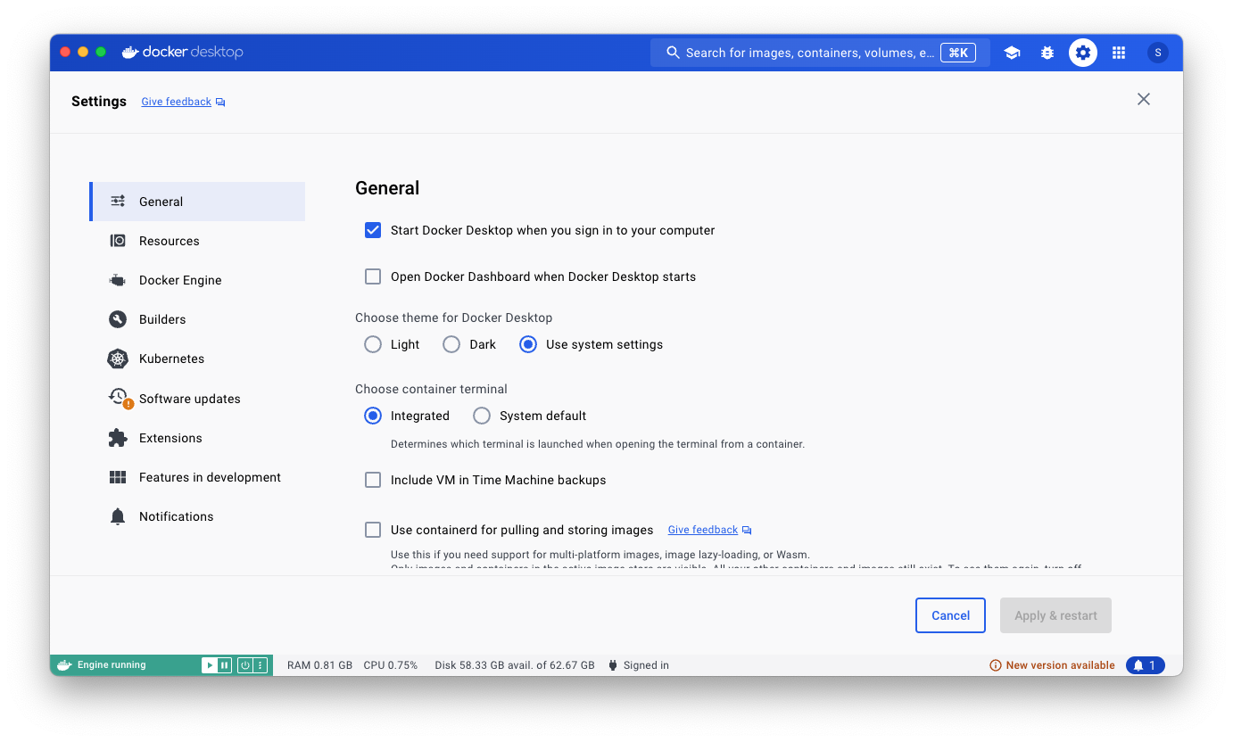 一番上のStart Docker Desktop when you sign in to your computerを有効。