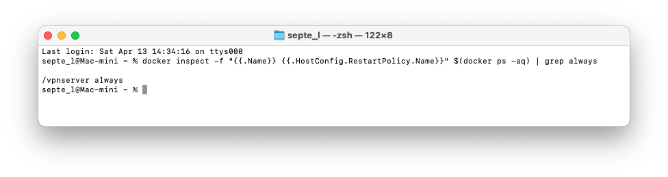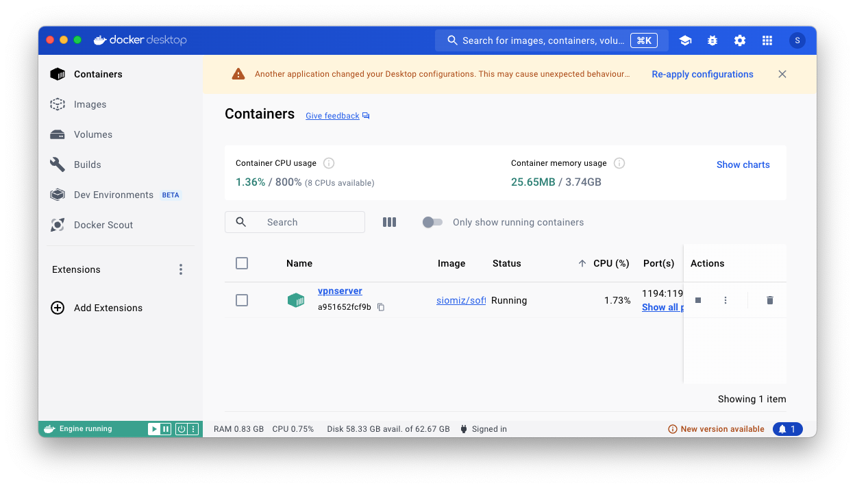 macOSを再起動するとDockerが起動し、Dockerが起動するとSoftEtherVPNのコンテナが起動する。