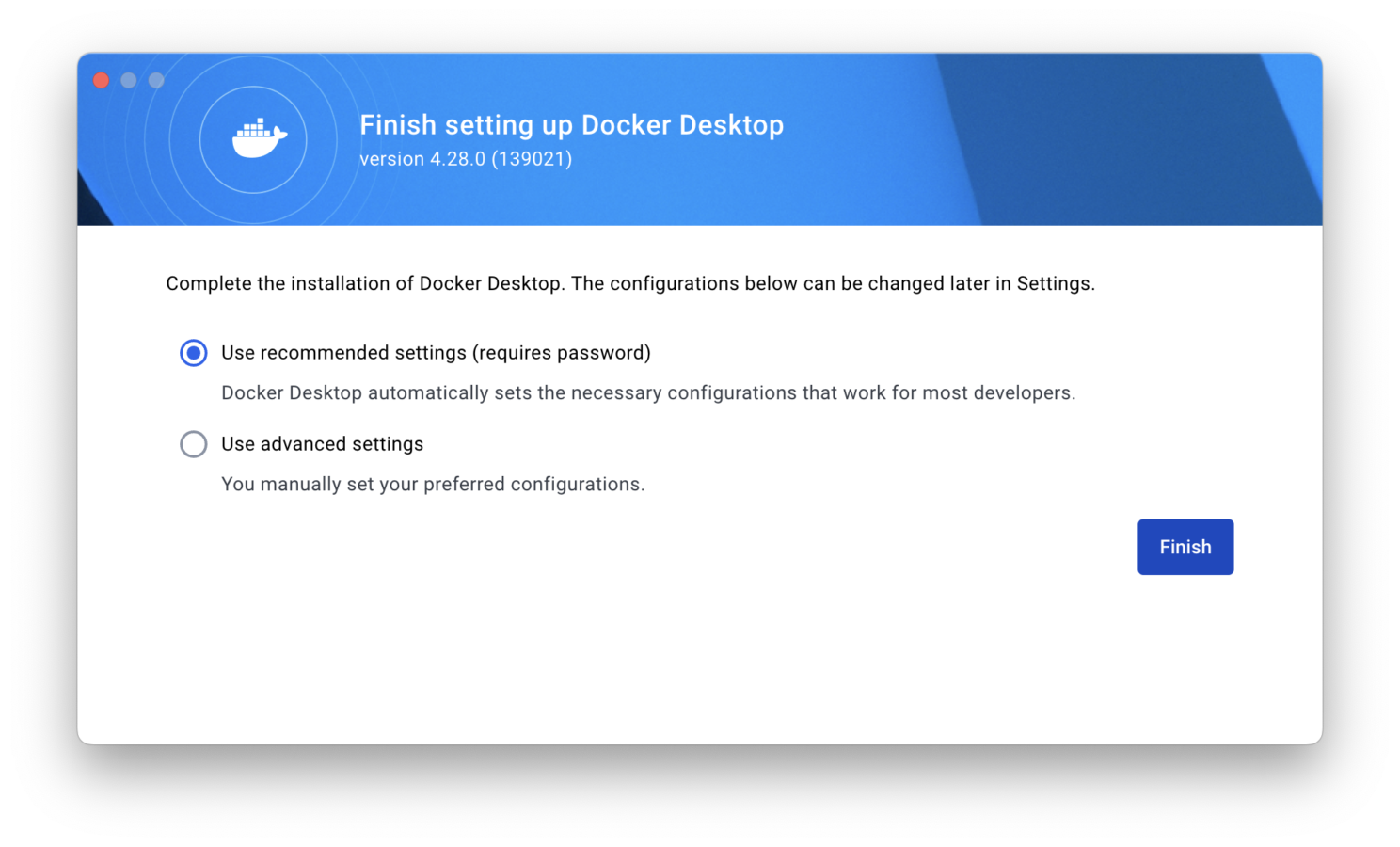 規約が出るのでAccept、設定方法が出るのでそのままFinish。