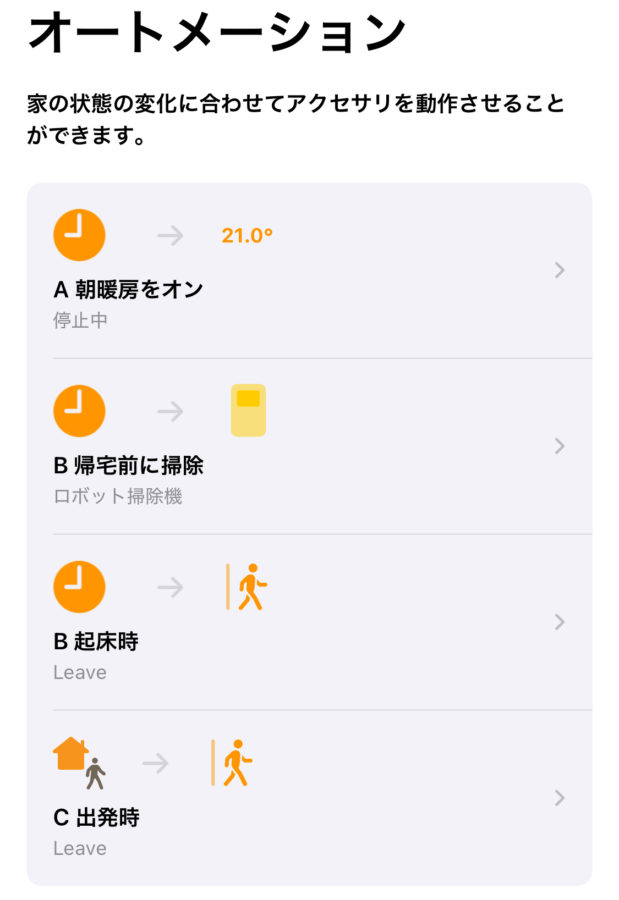 これらはオートメーションにも設定し、起床時刻前にActive・外出時に Leave等すっきりまとめられるのも魅力。