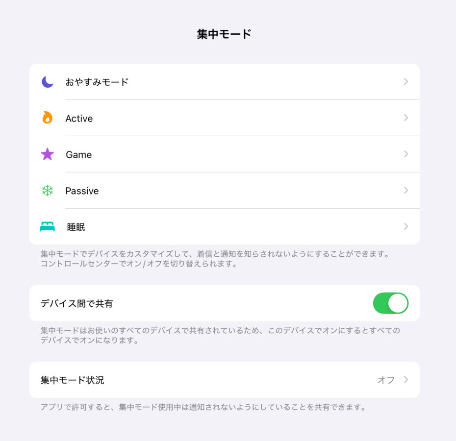 集中モードの状況は同期されるが、フィルタはデバイスごとに設定しなければならない点も注意。