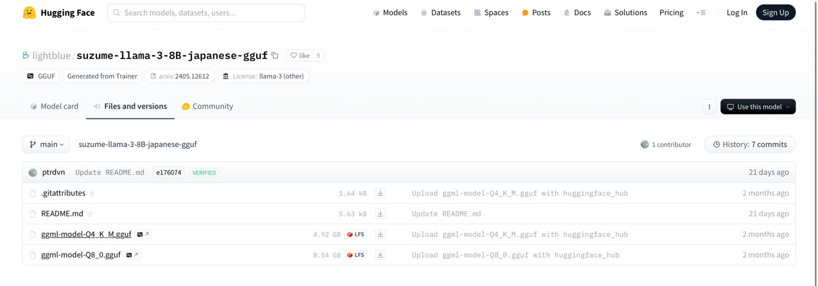 メニューからFiles and versionsにアクセス、ggufファイルをダウンロードする。