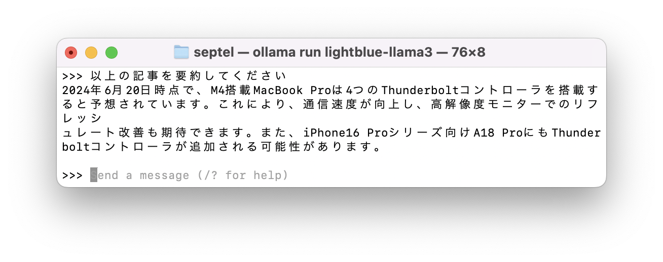 Ollamaには言語モデルを拾ってくるストア的な機能もあるが、Llama3公開直後だからか日本語モデルはなかったので野良のモデルを使用。Llama3をベースとし、日本語利用に特化させた軽量モデル。