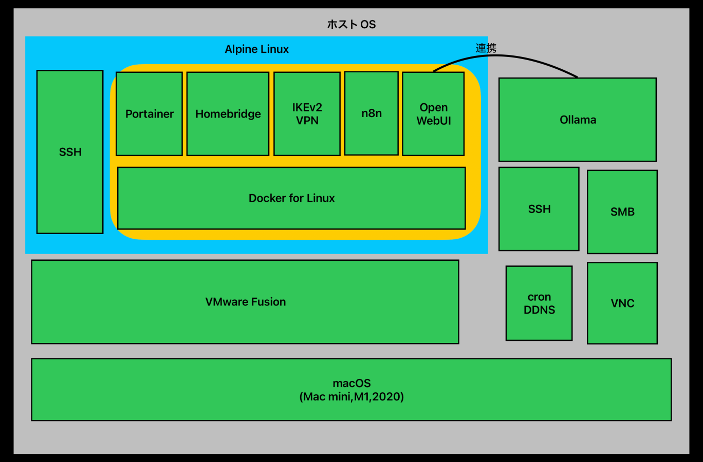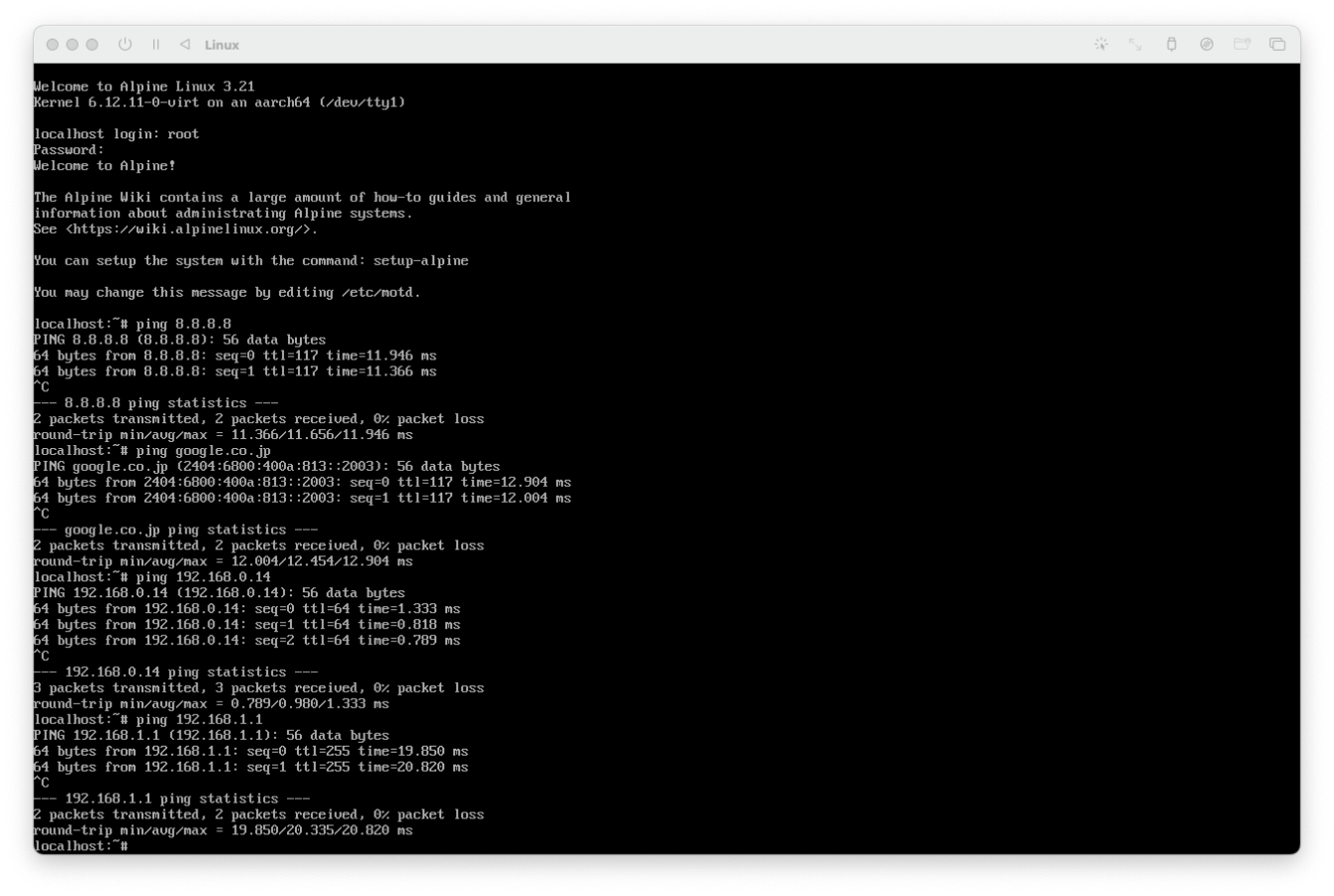 1週間試行錯誤した結果、ARM64に対応したAlpineLinuxのVirtualが最適という結論が出た。Homebridgeの互換性問題も解決したし、ようやく設定AppとPortainer/SSHだけで全てのサーバー機能を管理できる土台が整った。