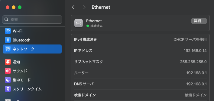 ちなみにゲートウェイ・DNSの情報はMac側で確認可能。メインのネットワークで表示されてる数値を丸コピすればOK。