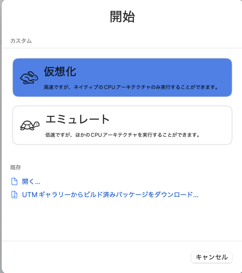 UTMで新規仮想マシンを作成→仮想化→Linuxと選択。