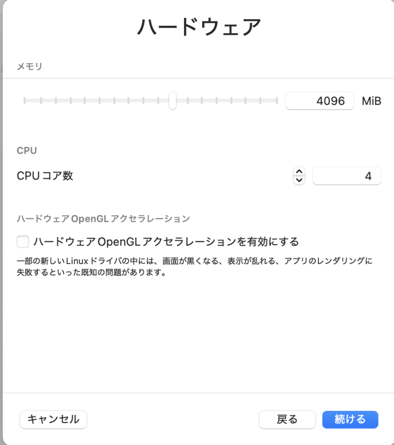※追記:Apple仮想化にした方がパフォーマンスは多分出るけど、USBパススルーに非対応らしい。USBが必要なければApple仮想化でも良い。