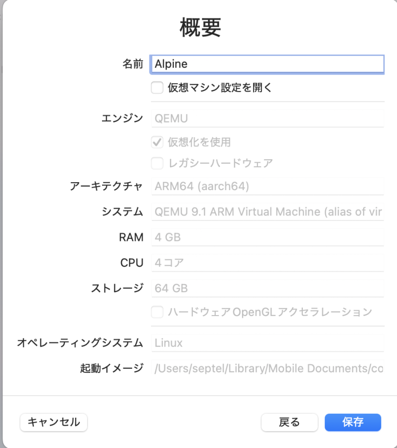 Apple仮想化はせず、ディスクイメージとしてAlpine VirtualのISOを指定して次へ。