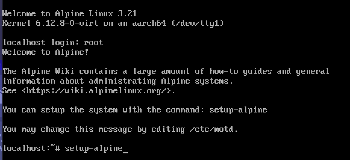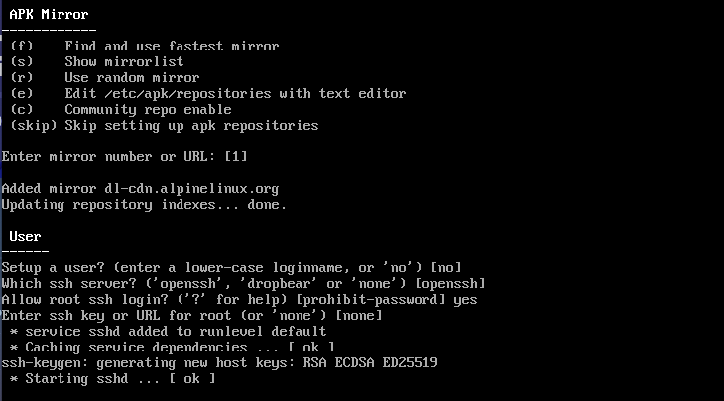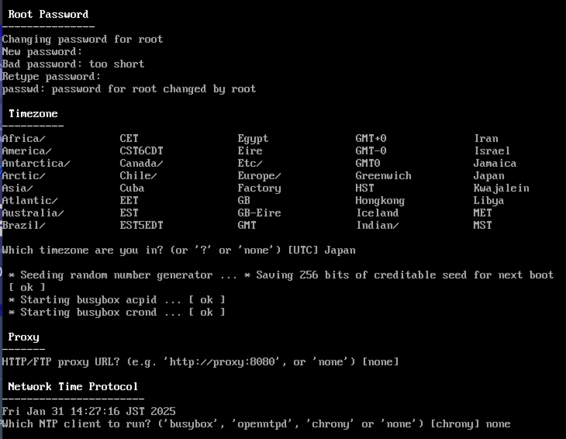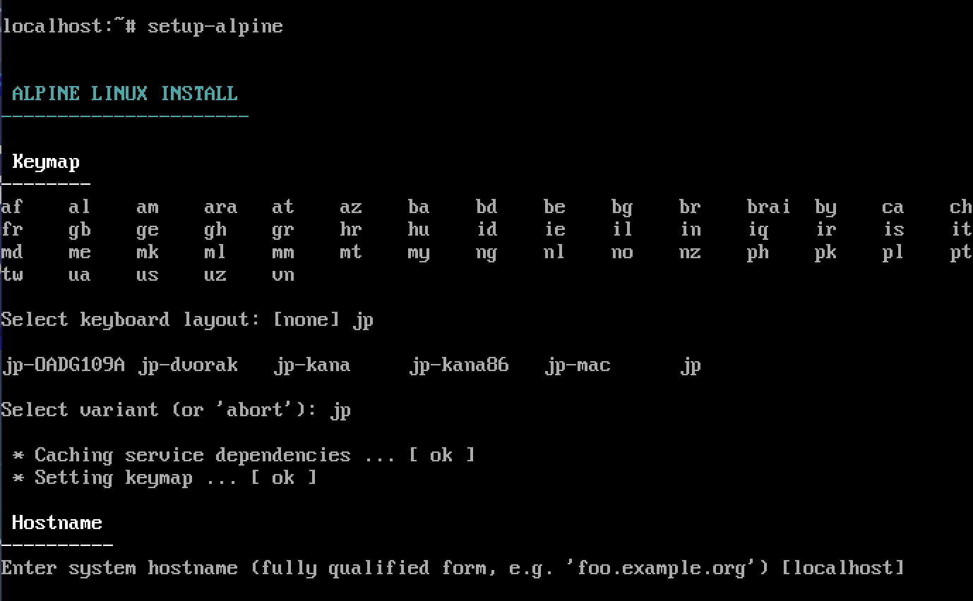 そのままsetup-alpine でセットアップ起動。