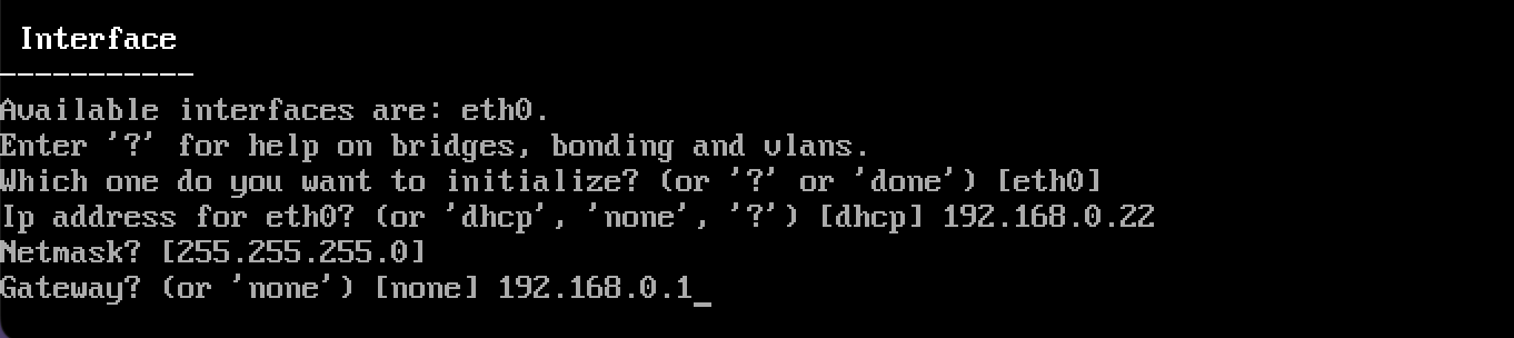 ネットワークアダプタの設定。既に仮想マシンに追加したブリッジアダプタを選んでくれているのでそのままEnter。固定するIPアドレスかdhcpを選んで入力。IP固定の場合はサブネットとゲートウェイも入力。