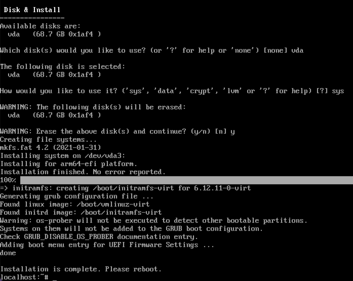 ディスク選択は表示されたものをそのまま、今回はvda。