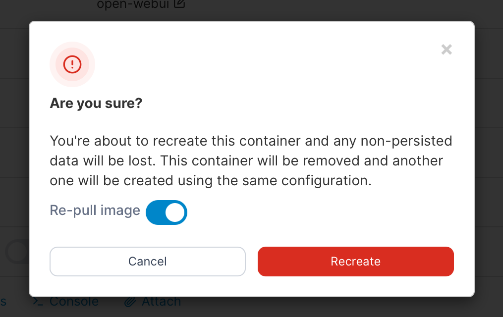 コンテナは一つの環境であるため、Pullしたイメージだけでなくコンテナ本体までも一度削除して入れ直す必要がある。ボリュームに保管されるべきデータは消えないとは言え、特にアプデ頻度の多いOpen WebUIなんかだと毎回やるのはかなり面倒。わたしは数ヶ月忘れていて、一回やった瞬間あらゆる要素が様変わりしてビックリしたほど。