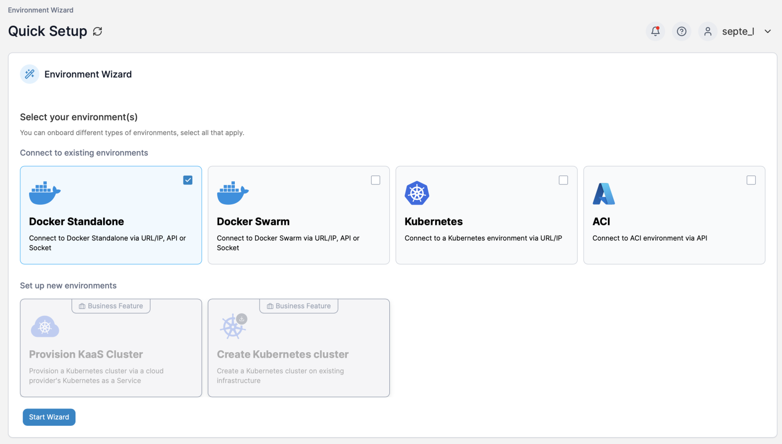 今回はゲストのAlpine側にも通常のDocker環境を構築したので、Docker Standaloneを選択してStart Wizard。