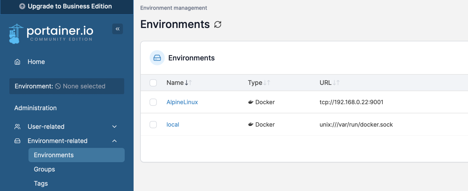 今回はlocalとゲスト1つを管理したいため、Portainerをセットアップした後からゲスト1つのみ追加する。