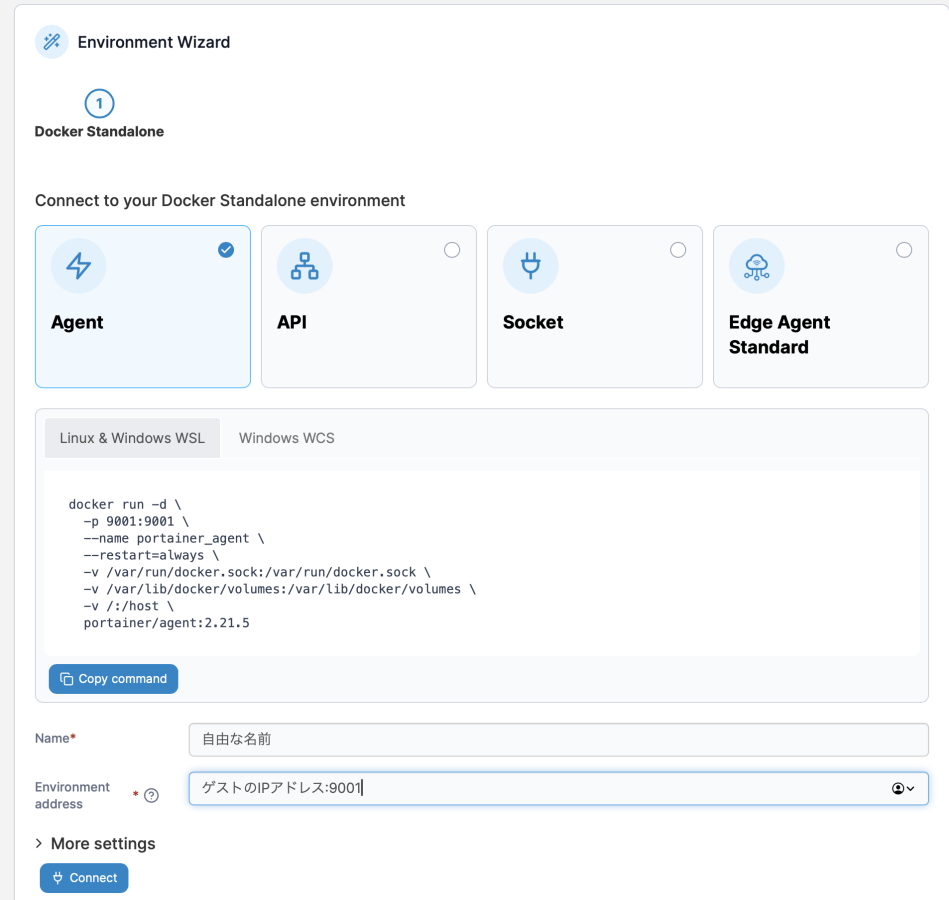 その後下部のnameに好きな識別名、Environment addressにゲストのIPアドレスとポート番号である9001を打ち込む(これはAgentのdocker runで指定されている)。Connectで接続完了。
