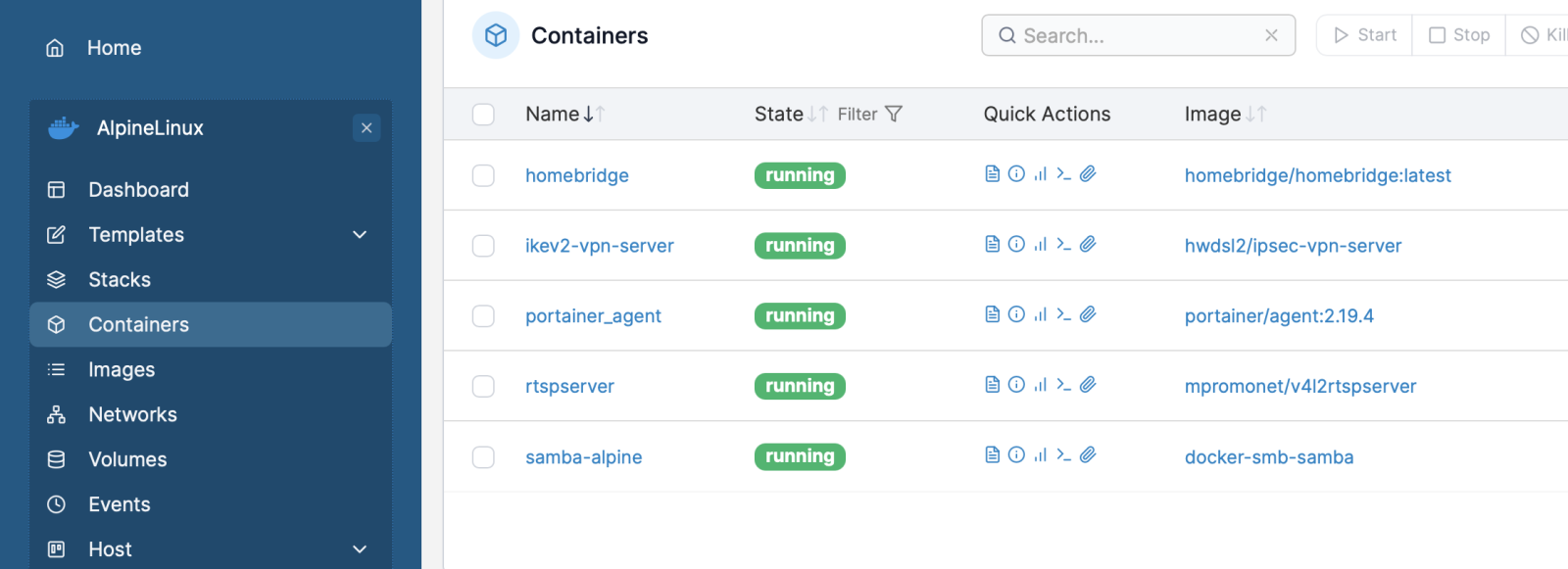 メモリ・ネットワークといった各種リソースの使用状況に加え、稼働中のコンテナの確認や停止・再開が可能。ちなみにPortainer自身のコンテナは停止できないようになっているので安心。