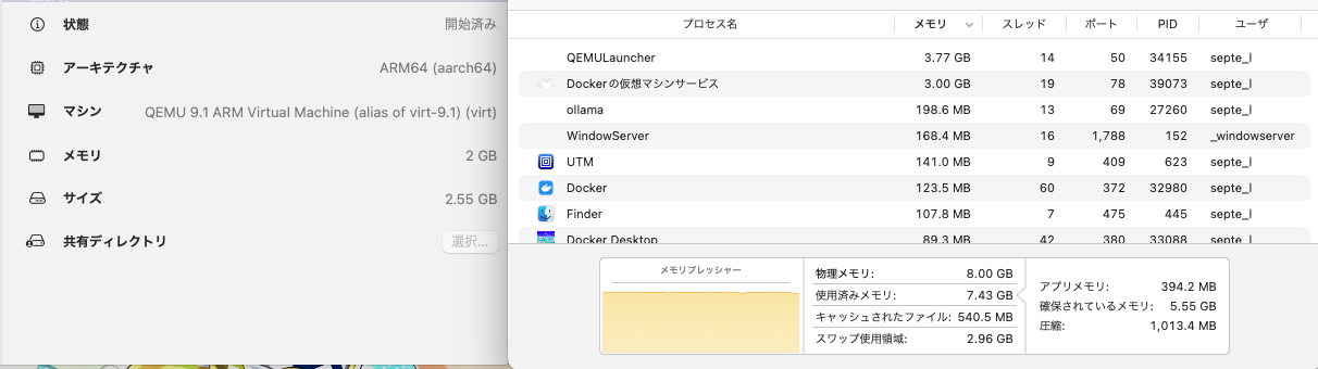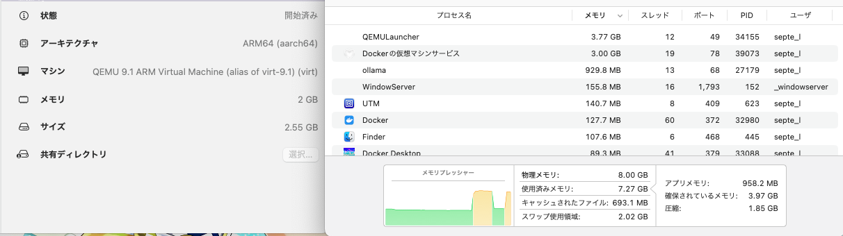 仮想マシンで要するメモリを最小にして割り当てを限界まで絞ることで、出来る限りmacOSの動的なリソース配分に全て任せてしまおうという寸法。実際Ollamaとマイクラサーバーは同時に動かさないため、それぞれが停止時にメモリを解放することでメモリ不足は起こらなくなる。