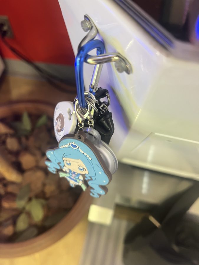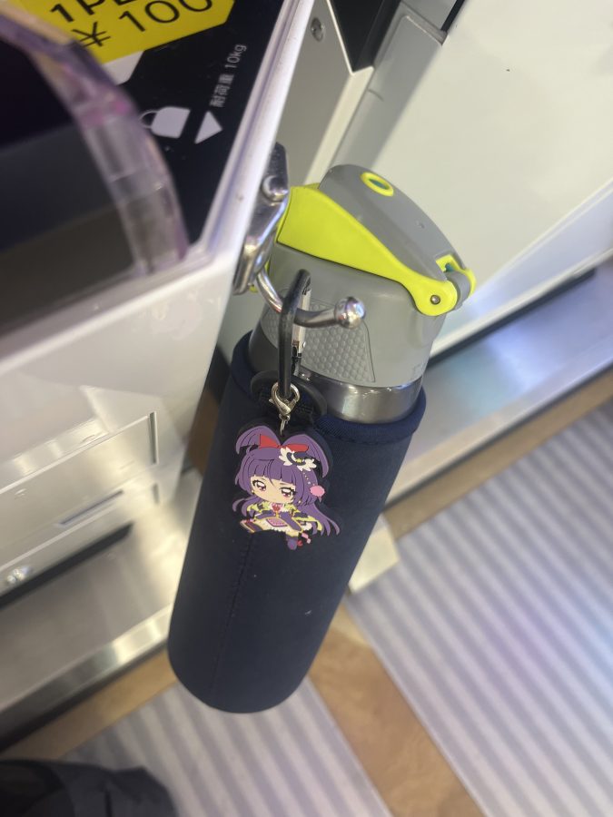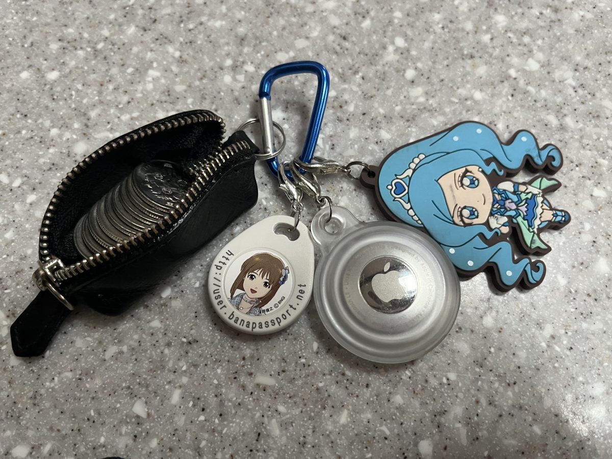 ついでにカラビナ付きのドリンクホルダーを用意しておくと、CHUNITHM等ではカバン用のフックに引っ掛けられたりするのでおすすめ。AirTagをつけて盗難防止しておくのもいい。